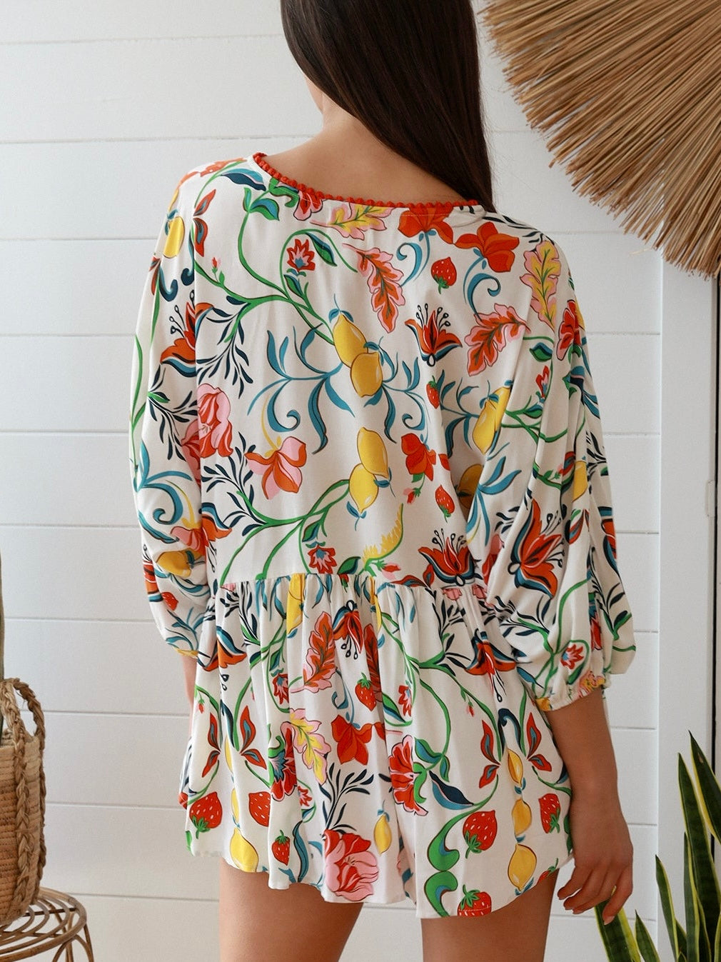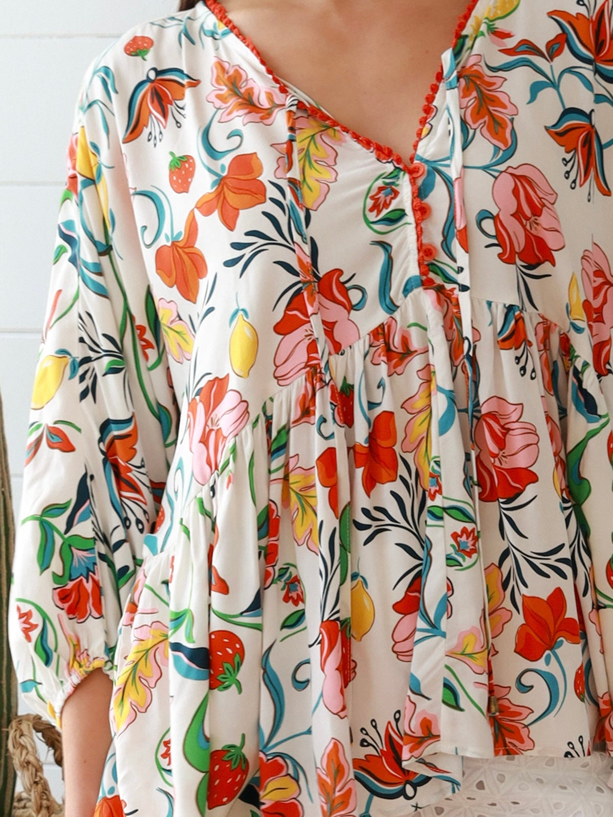 Made from 100% rayon, the fabric is soft & breathable, it's the perfect oversized, relaxed fit. Featuring a V neckline, button up front with lace detailing and elastic cuff sleeves. Please note this fabric will shrink by 5% after the first wash.