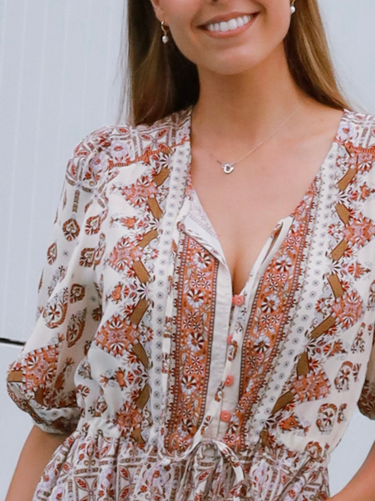 Made from 100% rayon, this dress is not only comfortable but also stylish. The V neckline adds a touch of elegance, while the button up bodice allows for a customizable fit. The tie under the bust cinches in your waist for a flattering silhouette. The tiered skirt features a contrast hem print, adding a unique and eye-catching detail. The half sleeves provide coverage while still keeping you cool.